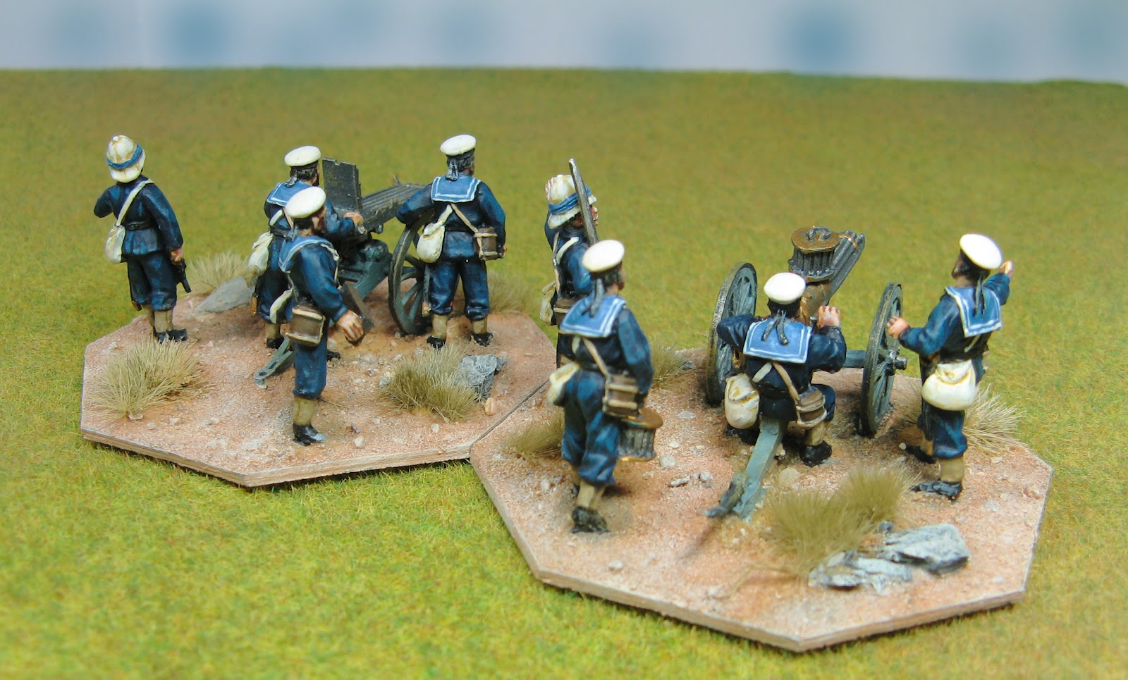 That perennial favourite -a bunch of rough & ready matelots, hauling around early MG's for keeping the natives in check. These are the first Imperial troops off the stocks for the Sudan collection. A Gardner and Gatling Gun , both Perry sets. I have based them on an Octagonal base so that they can easily fit into the corner of squares etc. There wasn't much opportunity or need for conversion work here, the only little bit of extras being a pile of spent cartridge cases made out of small gauge brass wire , just cut and fixed with a little superglue. The blues were done using the Andrea Color blue set which I really like using - really easy to highlight and shade with.